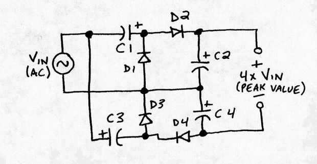 Vamos a empezar con el quadrupler voltaje. Es el circuito en la primera foto, con todos los diodos y condensadores. Mirar D1 y C1. Imagina que la fuente de CA es en este momento la polaridad correcta para cargar C1 con D1. Ahora, C1 está totalmente cargada. La polaridad de los interruptores de alimentación de AC. Ahora, cargos de C2 a través de D2, para doble tensión de pico de la fuente de CA, porque C2 no es ser acusado sólo por la AC de la fuente, se está cargando por la CA fuente en serie con la C1 ya cargada. Así que doble de voltaje de la fuente CA es ahora a través de C2. El mismo principio funciona en C3 y C4, C4 consigue encargado de doble voltaje de suministro de CA así, y puesto que están en serie, el circuito salidas 4 veces el AC de voltaje. Puede utilizar este circuito después de un puente en h impulsado por una onda cuadrada si usted necesita un convertidor dc-dc simple, pero recuerda: la salida y la entrada no pueden compartir una conexión a tierra! (En mi caso no hay ninguna conexión de tierra en la entrada ya que es solo un transformador.) Esta descripción no hace caso de caída de tensión directa de los diodos. En realidad cada diodo quema 0.7V más o menos el voltaje de salida total.