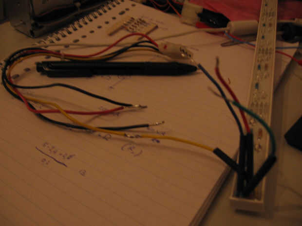 Resistencias de tres 10 k se asegurarán de que el FET no se enciende cuando no se supone que encienda. Otros tres limita la corriente máxima que el FET se drenará. La parte superior tres resistencias están ya en la tira RGB.