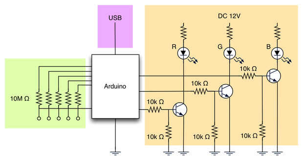OK, el tiempo para algunos esquemas! (Ver foto) es una representación básica del circuito (hará uno más pronto). Los sensores capacitivos están incluidos también (parte verde). Básicamente hay tres componentes que tienen que explicarse: