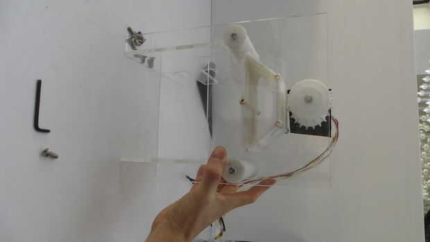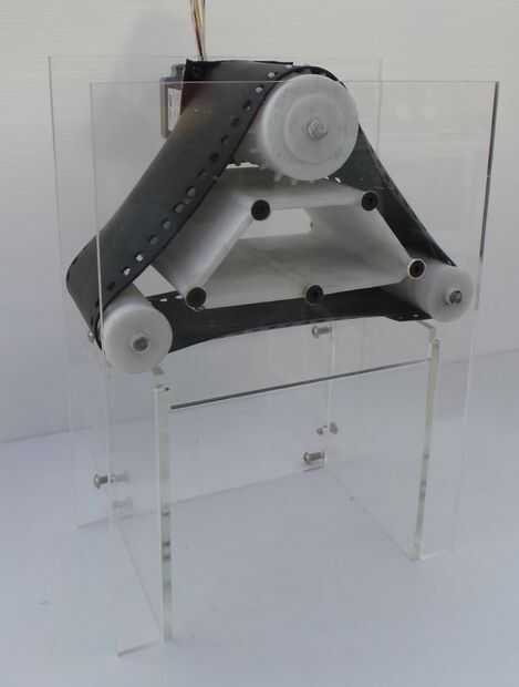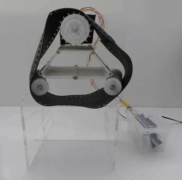 Deslice los rodillos en su lugar, con el segmento de aluminio largo hacia la parte posterior del dispositivo. Deslice el rodillo de la impulsión del motor. Nota para la geometría alterada: esto está diseñado para presionar en el eje HT23-398-esta geometría se debe rehacer si usted selecciona un diverso motor; He probado por un bloque de 1 X 3 cm con dos formas diferentes de impresión primero antes de imprimir el rodillo completo. Ahora deslice la correa en su sitio. Tiene una dirección. El borde plano de los orificios de impulsión debe llevar (es decir, los detalles de borde plano los radios como las vueltas del rodillo).