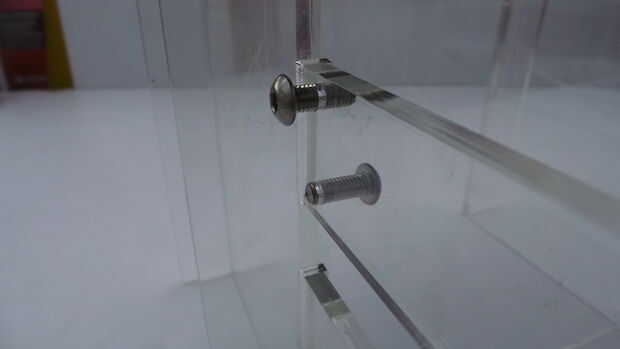 Finalmente, atornille los pernos de la placa lateral (M5 redondeados) en su lugar (nota que esta articulación es geometría conducido actualmente requiere exactamente 6mm las placas gruesas para trabajar. El principio es que el centro del orificio debe ser 20% del diámetro exterior del perno hacia adentro hacia la placa para que el perno es forzado en y bloquea las paredes laterales en su lugar. Técnicamente se trata de una geometría demasiado restringida pero no es un problema con materiales flexibles como el acrílico).