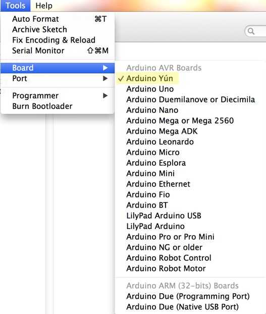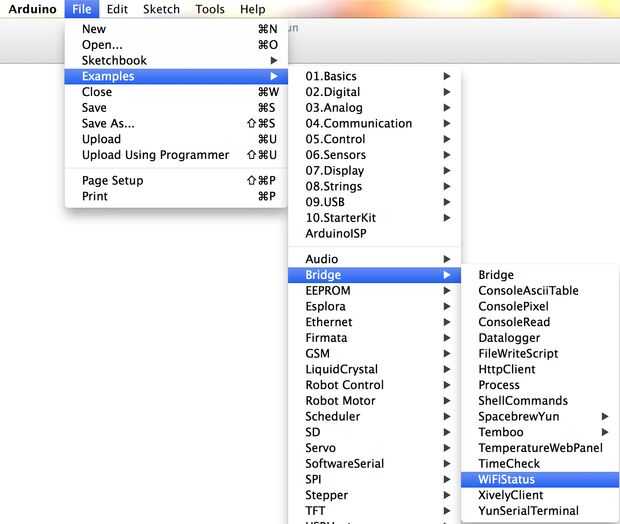 Ahora estás listo para ejecutar dibujos de ejemplo con su Arduino Yun. Abra el IDE de Arduino Beta que descargaste al principio de este tutorial y vaya a archivo > ejemplos > puente > WiFiStatus. Haga clic en el dibujo WifiStatus. Antes de ejecutar el sketch, asegúrese de tener el Yun de Arduino seleccionado en herramientas > Junta. Además, asegúrese de que está conectado a tu wifi regular, y no uno emitido por el Yun. Por último, seleccione el puerto que está conectado su Yun en herramientas > Puerto (el mio es /dev/tty.usbmodem1411 (Arduino Yun). Una vez haya finalizado todo esto, subir el bosquejo a su Arduino y haga clic en herramientas > Serial Monitor para seguir su estado de la wifi. Eso es todo! En este punto, debe ser capaz de ejecutar algún ejemplo dentro del directorio de la puente, como TimeCheck, YunSerialTerminal, etc..
