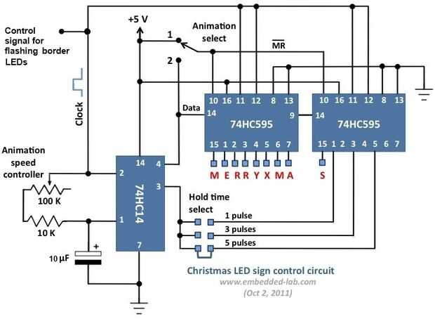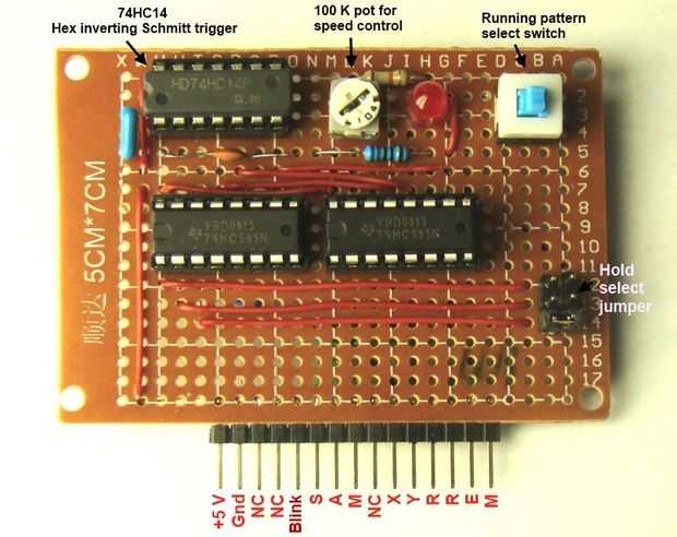 El 74HC14 proporciona seis buffers invirtiendo con la acción del disparador de Schmitt. Uno de ellos se configura como un oscilador de relajación con un resistor externo (pote de 100K + 10K fijadas) y un condensador (10 uF). La frecuencia de oscilación está dada por f ≈ 1 /(0.8 x RC). Así, con un pot de 100K y una resistencia fija de 10 K, se puede variar la frecuencia de aproximadamente 1 Hz a 13 Hz. Esta señal de reloj controla el parpadeo de la frontera con LEDs, y por lo tanto, parpadeará a la frecuencia de reloj.