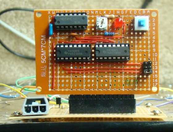 Los dos registros de desplazamiento 74HC595 son en cascada para formar un registro de 16 bits en serie cambio paralelo-hacia fuera. Esto requiere conectar la salida serie (pin 9) de uno de los datos en serie I / pin P (14) de la otra. Las entradas de dos reloj (Shift register reloj y reloj de registro de almacenamiento de información) de ambos son atadas y expulsadas por la misma señal de reloj del oscilador de la relajación. Recuerde que el oscilador de la relajación funciona libremente y siempre está proporcionando la señal de reloj para el registro de desplazamiento combinado de 16-bit. Así que lo que aparece en la salida del registro de desplazamiento depende del nivel de la lógica aplicado en el pin de entrada de datos serie (14), que en realidad está conectado a la salida del buffer inversor segunda (pines 3 y 4) en el dispositivo 74HC14. La entrada a este inversor procede de pernos Q1, Q3, o Q5 de salida (seleccionable mediante un conector puente) del segundo cambio de registro. Perno no. 10 del 74HC595 es la entrada de reset de la memoria y es una señal baja activa. Puede ser o bien conectado a la lógica alta (+ 5 V) todo el tiempo o a la salida del segundo Inversor; hay un interruptor para hacerlo. Realmente controla la animación de la pantalla (se describe más adelante). La primera salida de datos paralelo de 9 bits (Q0-Q7 de primera 74HC595) y Q0 de segunda 74HC595 de la conexión en cascada conducir los transistores de conmutación para los nueve personajes en el letrero. En la próxima sección, voy a describir su funcionamiento en más detalle.