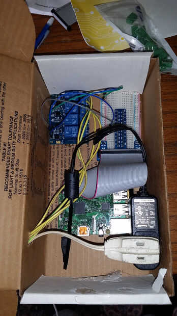 Su harware se verá básicamente como la foto de arriba, pero usted puede configurarlo de todos modos que desee en su caja... ahora un amigo creativo va a reconocer que el "Zapatero" y breadboard no son realmente necesarios. Puede conectar los cables (con puentes de hembra-hembra) directamente entre la Pi y el relé... sí, puede, pero no estoy que cubre...