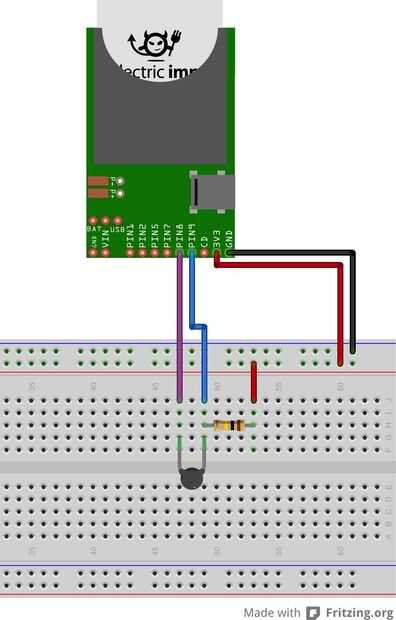 Para medir el voltaje en el termistor, hemos creado pin 9 como un convertidor de analógico a digital, que nos permite tomar una medida exacta de la tensión analógica sobre el pin usando al imp. Revisa el programa en unos pocos pasos para ver cómo eso se hace.