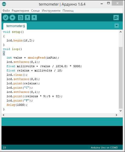 <p>// include the library code #include // initialize the library with the numbers of the interface pins LiquidCrystal lcd(12, 11, 5, 4, 3, 2); // initialize our variables int sensorPin = 0; int tempC, tempF; void setup() { // set up the LCD's number of columns and rows: lcd.begin(16, 2); } void loop() { tempC = get_temperature(sensorPin); tempF = celsius_to_fahrenheit(tempC); lcd.setCursor(0,0); lcd.print(tempF); lcd.print(" "); lcd.print((char)223); lcd.print("F"); delay(200); } int get_temperature(int pin) { // We need to tell the function which pin the sensor is hooked up to. We're using // the variable pin for that above // Read the value on that pin int temperature = analogRead(pin); // Calculate the temperature based on the reading and send that value back float voltage = temperature * 5.0; voltage = voltage / 1024.0; return ((voltage - 0.5) * 100); } int celsius_to_fahrenheit(int temp) { return (temp * 9 / 5) + 32; }</p> #include <LiquidCrystal.h> LiquidCrystal lcd(12, 11, 5, 4, 3, 2); //Digital pins to which you connect the LCD const int inPin = 0; // A0 is where you connect the sensor void setup() { lcd.begin(16,2); } void loop() { int value = analogRead(inPin); // read the value from the sensor lcd.setCursor(0,1); float millivolts = (value / 1024.0) * 5000; float celsius = millivolts / 10; lcd.clear(); lcd.setCursor(0,0); lcd.print(celsius); lcd.print("C"); lcd.setCursor(0,1); lcd.print((celsius * 9)/5 + 32); //turning the celsius into fahrehait lcd.print("F"); delay(1000); }