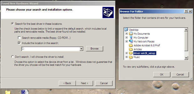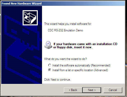 Conecte el dispositivo a un puerto USB. Windows lo detectará y le pedirá que seleccione un controlador. ASEGÚRESE DE HACER CLIC EN 'EXAMINAR PARA DRIVER PERSONALIZADA'. Desplácese a la ubicación del archivo .inf que se incluye con el proyecto archive(driver-win2k_winxp). Windows utilizará este archivo para instalar el dispositivo.
