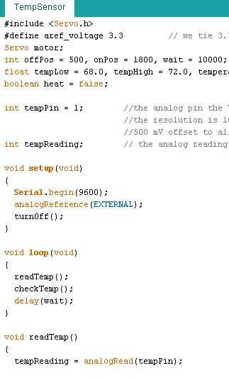 flotador tempLow = 68,0, tempHigh = 72.0, temperatureF; Ajustar tempLow y tempHigh a la gama de temperatura que se desea que la habitación en