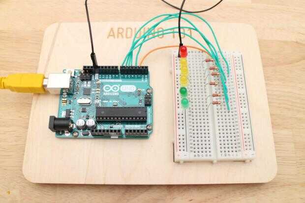 Permite comenzar por acaparamiento 6 LED de nuestro kit. Elegí 2 verde, 3 amarillos y 1 rojo. Usted puede agregar que más si desea, asegúrese de agregar una resistencia extra y cable a un pin del Arduino abierto. Tenga en cuenta que el Arduino no puede proveer mucho del poder, así que en un determinado punto agregando más LED solo hace todo atenuador.
