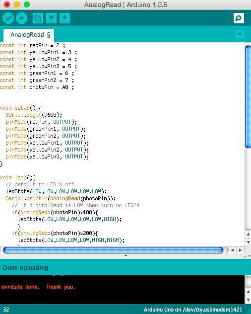 Para codificar el theremin luz vamos a ampliar en la lección anterior de sensor análogo y llevarlo un paso más al tener un sensor de activar múltiples acciones de LED. En primer lugar, descargar el adjunto LightTheremin.ino y abre en el IDE de Arduino. Para comenzar tenemos que inicializar todos los 6 LED. Guardé las convenciones de nomenclatura estándar aquí, pero usted puede etiquetar el LED de acuerdo con cualquier convenio que prefiere.