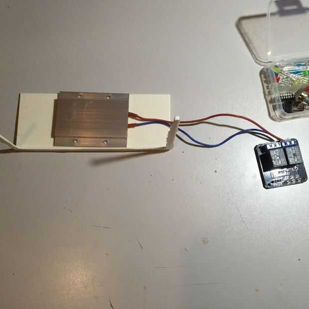 Conectar el GND de Arduino a la GND de la placa y + 5V de arduino a la línea positiva de la placa. Conectar el GND del relais a la tierra de barreljack en tensión (+) de barreljack a Vin del relais. Este barreljack está conectado a un adaptador de 12V para alimentar la PTC ceremic elemento de calefacción.