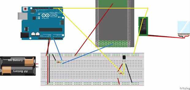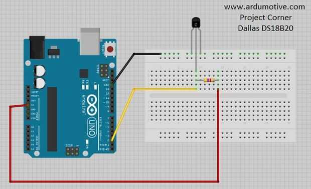 El datapin del sensor de temperatura DS18B20 está conectada con un resistor de pull-up a digitalpin 2 de arduino. El cableado del DS18B20 es como en la foto de codebender_cc.