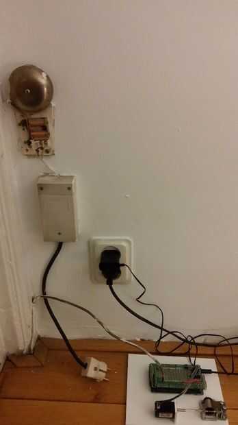 La siguiente es conectar el timbre de la puerta, usé un desplegable de 10kOhm de resistencia en el lado de la tecla y un 0.1uF entrada condensador de cerámica a debounce el botón. Sólo tiene que conectar un cable del botón de la entrada digital de resistencia/condensador/arduino y el otro cable a 5v. Cuando se presiona el botón la entrada digital se vaya de bajo a alto. También se utiliza una entrada digital que es capaz de provocar una interrupción para no tener que leer constantemente el estado de la entrada.