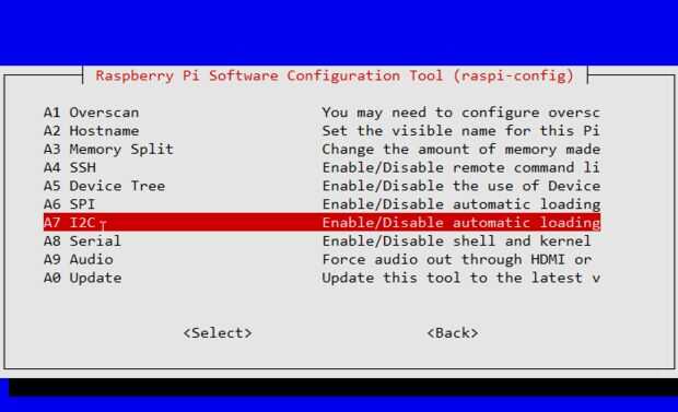 Cuando se ejecuta primero el sistema operativo de frambuesa pi, le llevará a través de la configuración. Si esto no es la primera vez, puede escribir sudo raspi-config para llamar hacia arriba. Haga clic en "Opciones avanzadas" y "Activar I2C".