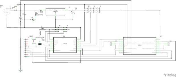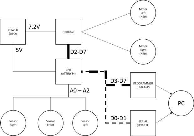 La placa base cuenta con un chip de ATTINY84A. Elijo este ATTINY porque tiene 8Kb de memoria y suficiente pines digitales para los sensores y el controlador del motor. Esta placa base tiene un botón de reset y un programador del conector (J1) usando el protocolo SPI (SLT, MOSI, MISO, CLK). 3 pines (J2, J3, J4) se utilizan como entrada analógica para sensores, 2 pernos (J5, J6) como entradas/salidas digitales y los otros pines se conectan a un L293D para dos motores N20. Te invito a buscar en Instructables.com sobre ATTINY. Hay muchos indestructible sobre cómo usar y programar ATTINY y arduino.