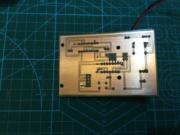 Adjunto los archivos de Fritzing que contienen las dos capas de este PCB. La capa superior contiene solamente algunas conexiones con via. Ellos pueden reemplazarse por cables para quién prefiere hacer un PCB "una capa". Usé el método de transferencia de tóner (otra vez Instructables.com es tu amigo). Para alinear las 2 capas, perforé 2 a cada lado del PCB antes de la transferencia. Con la ayuda de estos 2 pins me intercala el PCB con papeles brillantes (uno para la capa superior (espejo), una para la capa inferior) y alimenta a una máquina que lamina. Después del grabado, el resultado fue muy aceptable.