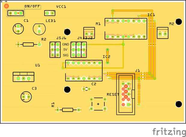 Utilice el tercer cuadro como referencia para colocar los componentes. Puse los conectores para los motores (M1, M2), los sensores (J2, J3, J4) y el programador (J1). Son 2 conectores libres (J5, J6) que pueden utilizarse para un tablero de hija o para depurar. Usé conectores que he encontrado en mi taller. No dude en utilizar lo que tienes o soldar los cables directamente. El conector J6 J2 usar el mismo régimen de pin; el pin cerca el ATTINY es la señal (SIG), el pin en el centro es de 5V y el pin fuera de es tierra (GND). Había soldado los cables con un conector JST para la batería. Dependiendo de la batería que tenga que elegir otro conector.