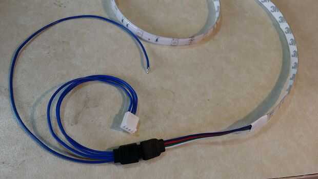Conectar los suministros de 5V y 12V y una pequeña sección de la tira del LED a la tarjeta y ejecutar el archivo output_test . Usé un rollo completo - consiguió bastante caliente y derretido el carrete fue por lo que no lo hacen. Debe flash rojo, verde, azul, blanco. Si hay cualquier salida no funciona, compruebe su soldadura y esquemas vuelva a intentarlo.