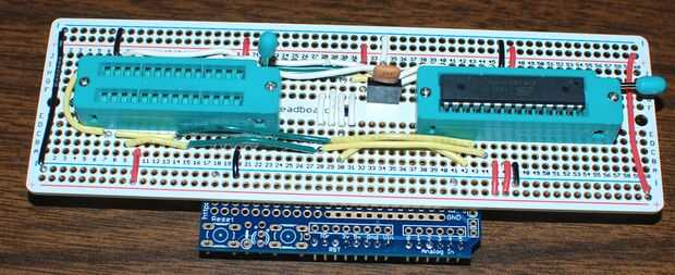 Si selecciona ATmega328 en un protoboard (reloj interno de 8 MHz) para un chip que ya tiene el gestor de arranque estándar necesita introducir el resonador cerámico. Un chip para correr con el reloj externo no funcionará sin él.