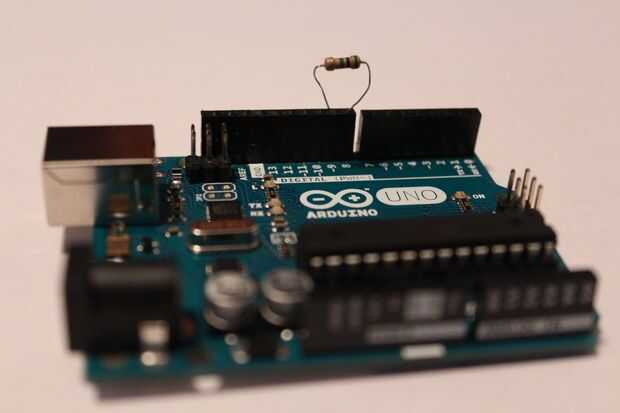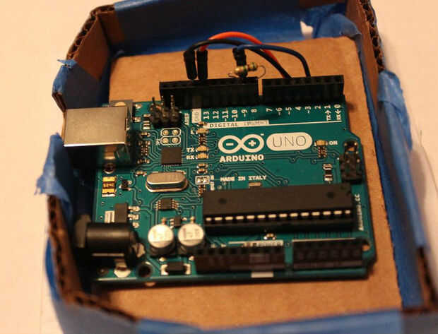 Ahora debe tener un pedazo de cartón con tres cables que se pega hacia fuera, como se muestra en la imagen. Coloque allí el Arduino. Asegúrese de que los cables pueden llegar a Arduino. Poner la resistencia entre los pines 8 y 9, con la banda oro frente pin 9. Coloque (soldadura o giro) el cable conectado a la hoja al lado de la resistencia con la banda de oro. Si está utilizando cables de protoboard como yo, debería poder apretarlas en el pin 9. Fije la pata del LED suelo (más corto) a la tierra y la pata positiva del LED (más) al pin 13. Con los cables, hacia el puerto USB de tu Arduino en el lado de la caja. Cortar un agujero para acceder a él (puede también cortar un agujero para el conector de alimentación si quieres. Yo utiliza energía del USB). Después de cortar un agujero, montar. Usé 3M montando la cinta para pegar el Arduino en el lugar. Acabo poner un pedazo en la parte posterior, había alineado al puerto USB en el agujero y presiona hacia abajo. Antes de cerrar el caso, conecte nada que quieres desencadenar al pin 12 y GND. También puede utilizar extensores de pin para extender los pines fuera el caso. Esto significa que usted podrá acceder en cualquier momento y cambiar las cosas a él conectadas. Una vez que todo está conectado, colocar el respaldo en el recinto.