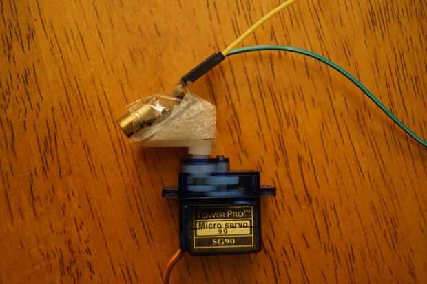 A continuación tenemos que montar el láser en el servo. Para obtener el ángulo derecho, para que el láser apuntaría a la planta en lugar de la pared, usé un trozo pequeño de poliestireno cortar un triángulo. Inicialmente, intenté usar pegamento para unir el módulo del laser para el poliestireno, pero simplemente había derretido en una pasta pegajosa rara y había conseguido por todas partes. Aprender de mis errores, use cinta.