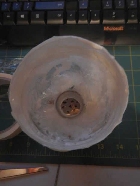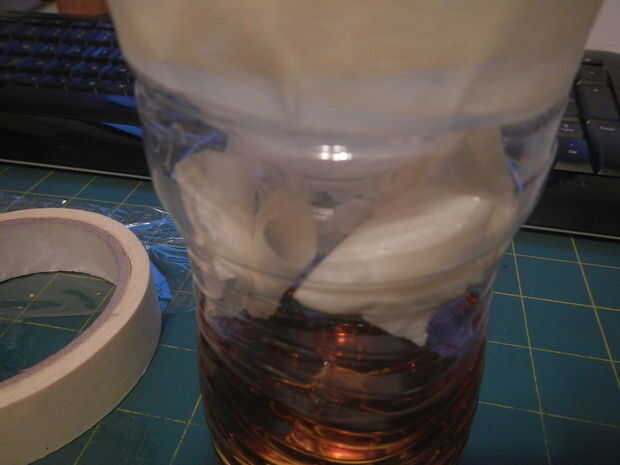 - Con rollitos de cinta de enmascarar, cinta de los bucles pequeños dentro de la botella de agua aproximadamente 2" pulgadas debajo de la parte superior. Esto es importante porque la parte superior de la botella se apoyará en la parte superior y si los lazos de cinta de enmascarar demasiado encima de la voluntad empuje la tapa hacia arriba y causan una abertura. Queremos mantener la trampa acabada de tener ninguna de las aberturas que en el centro (ver paso Nº 4)