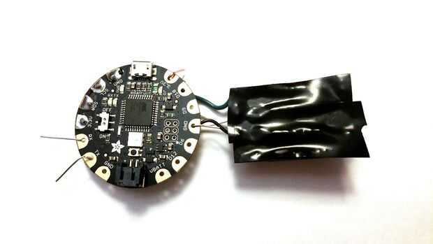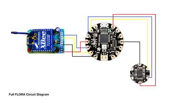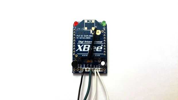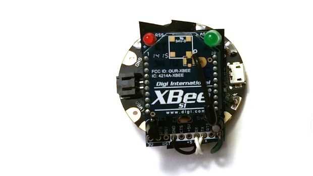 Enlazar los 3 V y pines GND entre los XBee y FLORA, como hiciste con el acelerómetro. Además de esto, usted necesitará enganchar la RX en el XBee a la TX en la FLORA y la TX en elXBee a la RX en la FLORA. La inversión aquí es debido al modo de comunicación. La FLORA está transmitiendo a lo XBee, así el transmisor sobre la FLORA está conectado al receptor en el XBee. Con el fin de reducir al mínimo el espacio de tu circuito, cable el XBee tal que puede poner en la parte superior de la FLORA (el lado opuesto del acelerómetro). Debe añadir cinta aislante en la parte inferior de lo XBee para evitar cortocircuitos.