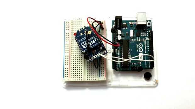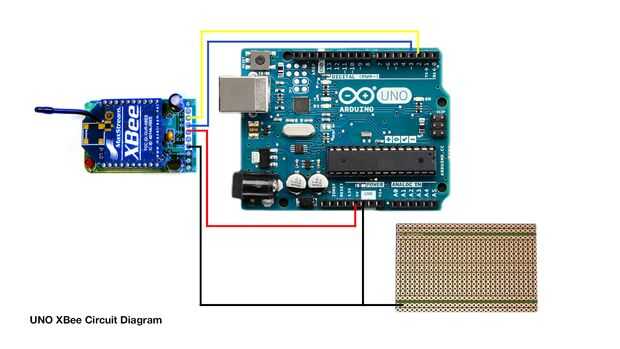 A continuación, debe conectarse el segundo XBee a la ONU. Esta vez a conectar los 5 V en el XBee a 5 V en la ONU y conecte a GND. Adicionalmente el código siempre debe RX conectar TX y pin 3 al pin 2. Puede probar con un protoboard sin soldadura, como se muestra en la imagen, si desea. O usted puede ir por delante una soldadura sobre la placa soldada.