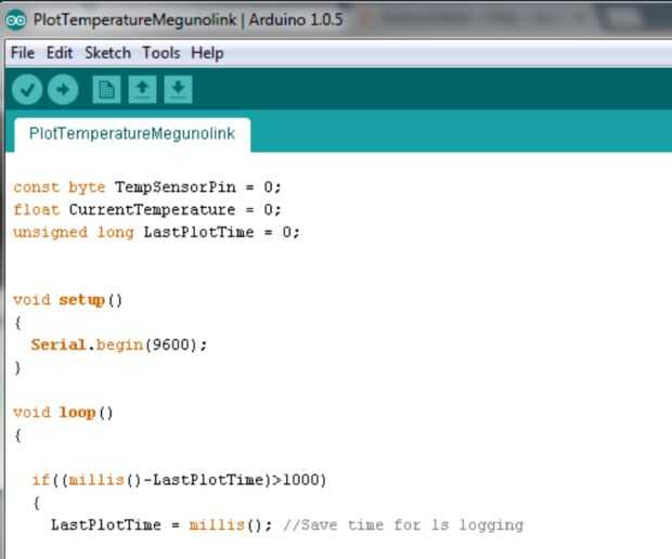 const byte TempSensorPin = 0;<br>float CurrentTemperature = 0; unsigned long LastPlotTime = 0; void setup() { Serial.begin(9600); } void loop() { if((millis()-LastPlotTime)>1000) { LastPlotTime = millis(); //Save time for 1s logging //reads 0-1023V -> 0-40degC CurrentTemperature = analogRead(TempSensorPin)*(float)40/(float)1023; PlotKitchenTemperature(CurrentTemperature); } } void PlotKitchenTemperature(float data) { Serial.print("{TIMEPLOT:Temperatures|data|Kitchen|T|"); Serial.print(data); Serial.println("}"); } Ahora simplemente programar tu Arduino con esto y estamos dispuestos a mirar el lado MegunoLink de las cosas.
