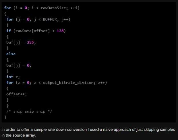 En su mayoría estos proyectos tenían en común que requirieron 8 pines de salida y resistencias para formar un DAC, que es bastante impresionante y suena bastante bien... Hubo sin embargo un par de proyectos que tratan de 1-bit audio necesitando sólo 1 pin de I/O digital para generar el sonido que es esencialmente una onda cuadrada. Me enamoré con esta idea debido a cómo suena porque cuando produzco música tiendo a utilizar una gran cantidad de distorsión y me llena de sentimientos difusos calientes!