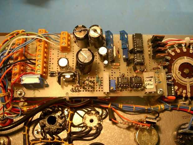 Desde ahora es la creación de un estable -75 V, cualquier punto a lo largo de una de las cadenas de la olla, con R78 thru R81 los, también es estable y puede ser seleccionado para proporcionar una tensión estable de máximo para el generador escalonado. Se crean cuatro voltajes en los limpiaparabrisas de los botes:-7.5V,-15V,-30V,-60V y seleccionada con el interruptor. Cap C10 elimina cualquier ruido residual. Pero esta tensión debe ser tamponado para producir una fuente de baja impedancia. U8 para ello. Ya que el op-741 amp no puede soportar más de 44V máximo a través de sus pines de alimentación, entonces tiene que ser ayudado. Los transistores Q13 y Q14 son conducidos por la salida del op-amp para cambiar de puesto el + y - voltaje en las clavijas de 741 alimentación para que los voltajes están cerca de la tensión de limpiador bote protegido, ya sea-7.5V o - 60V. El 741 se ejecuta realmente en cerca de 36 V entre + y -los pernos de energía. Puede ser demostrado matemáticamente que independientemente de qué voltaje de entrada a la 741, esta diferencia de 36V nunca cambia pero solo cambia de puesto hacia arriba o hacia abajo según sea necesario dentro del total disponible de 100V. Los transistores Q13 y Q14 también pueden estar parado solamente 40V máx. a través de ellas. Esto pone otro límite en la amplitud máxima de la señal que puede ser manejada. Este hecho entra en juego en el búfer de salida, U7A.