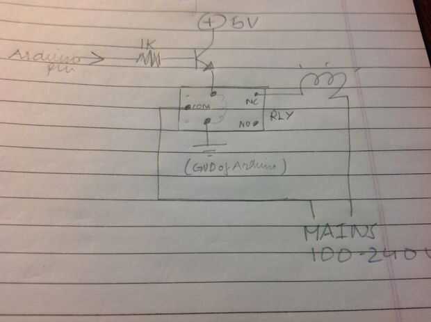 He proporcionado el diagrama del circuito para el transistor y relé. Hay también un diagrama de protoboard de Fritzing para ayudarle a comprender las conexiones.