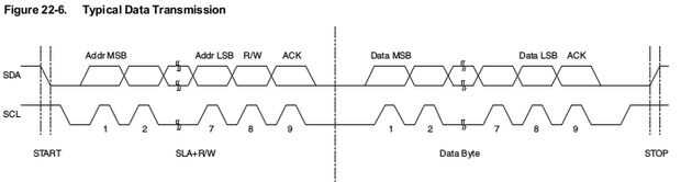 Debe examinar todos los diagramas en las páginas 208 a 211 y entender la mecánica de las señales de TWI. También discuten sobre "comienza repetida", arbitraje entre varios masters y otras cosas que no entrar ya que no necesitamos todavía.