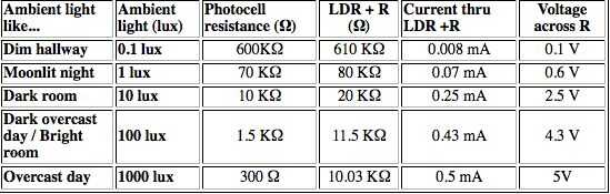 Esta tabla indica el voltaje análogo aproximado basado en la fuente de 5V un sensor luz/resistencia y resistencia de 10 K ohm telecine