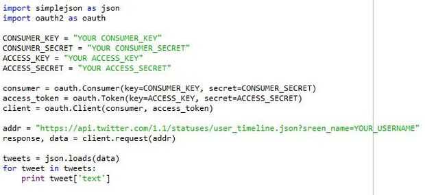 En este paso, será recuperar un simple tweet de tu timeline de twitter vía python