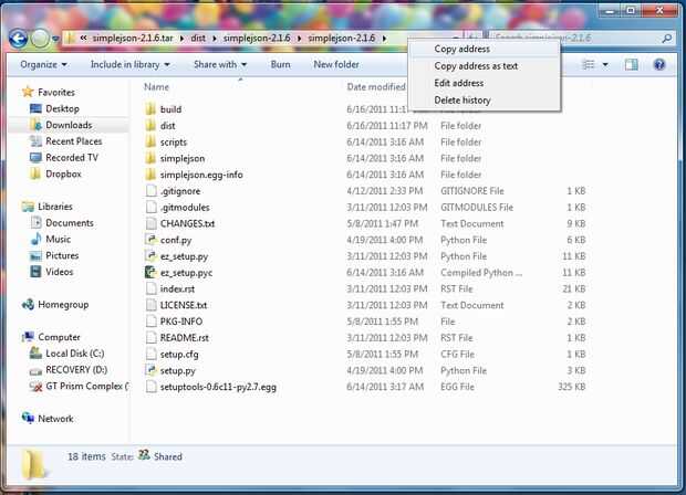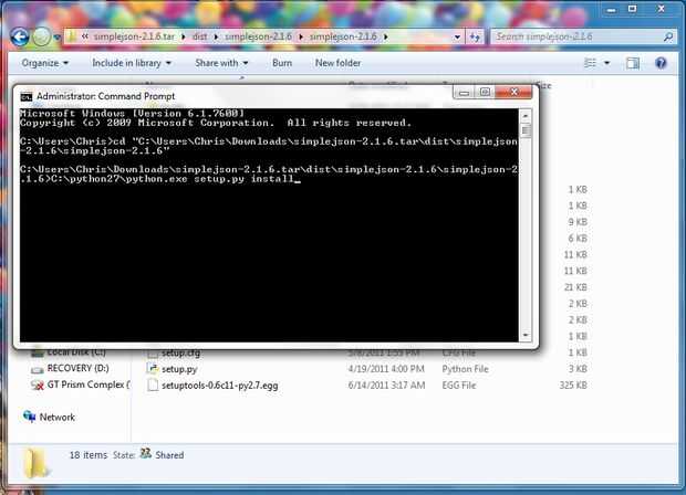 A continuación, vamos a instalar simplejson. La biblioteca de python-twitter tendrá que tener esto para conectar a la API de Twitter. Esta instalación es un poco más difícil. En primer lugar, descargar el paquete aquí y luego extraer el archivo. Una vez extraído, abra el símbolo del sistema y cambie al directorio que está dentro del directorio simplejson. La forma más fácil que encontré para hacer esto era navegar en el explorador de windows a la carpeta simplejson y luego copia la dirección. (En caso de no saber, cambiar directorios en el símbolo del sistema se consigue escribiendo "cd C:\Users\Chris\..."). Una vez que estés en la carpeta correcta, usted querrá escribir: