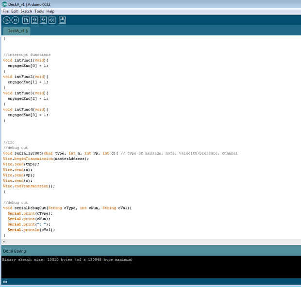 Aunque no es imprescindible para entender todo el código, sólo quiero explicar un fragmento de código que te ayudarán a entender cómo funcionan los mensajes de control. El código siguiente envía mensajes analógicos para un potenciómetro. Hay tres modos (depuración, I2C y MIDI) que activar o desactivar en las ediciones. Si está habilitada la depuración, mensajes se enviarán a través de USB en el monitor serial para ayudar con la depuración. 'serialDebugOut' es una función muy básica que escribí que envía estos mensajes seriales y pueden verse en la parte inferior del código. Si I2C está activado, mensajes se enviarán a través de I2C con el módulo principal que luego envían los mensajes a través de USB. Si que MIDI está activaday, a continuación este controlador se envía mensajes MIDI directamente a través de USB al ordenador. 'usbMIDI.' es un mensaje específico utilizado por Teensy ++ para mensajes MIDI. Leer más sobre MIDI Teensy aquí. Tenga en cuenta que puede editar el código para enviar muchos tipos de mensajes: Teensy USB Serial, Teensy USB teclado, Teensy USB ratón, Teensy USB Joystick, Teensy USB MIDIy serie de Arduino.