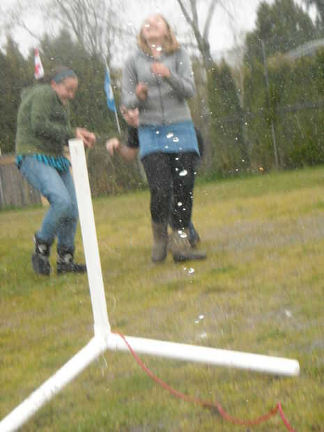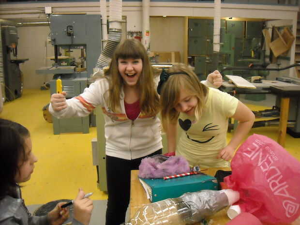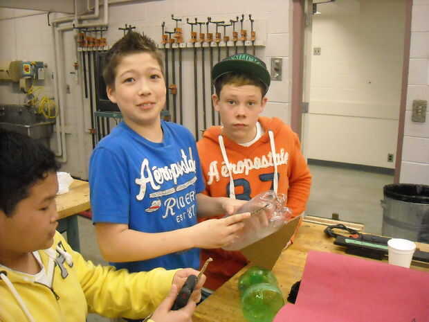 Recordar a los niños acerca de un par de cosas... Olvidan que el huevo tiene que entrar y salir fácilmente. Corté una portilla en la botella superior. Recordar a los alumnos que no debe perforar la botella del aumentador de presión en todos. Generalmente un equipo a olvidar esto. También recibirá al menos un equipo que se olvida que la botella de refuerzo va arriba hacia abajo y se cinta boca abajo las aletas en. Asegúrese de que entienden la simetría y que los cohetes funcionan muy bien si son aproximadamente 2 veces la longitud de una botella.
