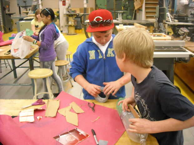 Mostrar cómo cortar una botella con seguridad con una cuchilla. Mantenga la tapa en al comenzar... hace más fácil. Yo corte una botella abierta cerca de 4 pulgadas desde la parte inferior que muestran cómo pueden apilar. Su hasta usted si usted quiere a los niños a utilizar las hojas. Me preocupa por eso les pido a los niños a utilizar tijeras después de empezar el corte para ellos.