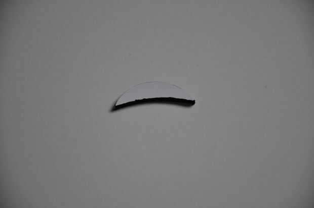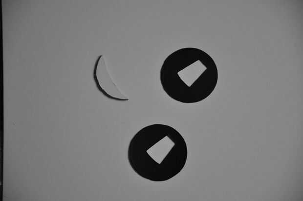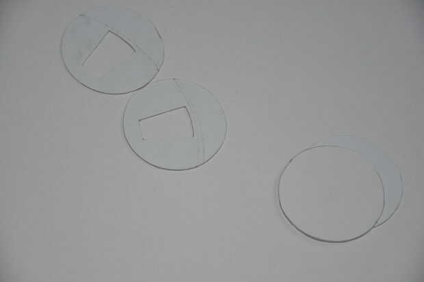 El marco de la ventana consta de dos discos circulares (la forma es completamente arbitraria) cada 5,5 cm de diámetro en el que se corta la forma de segmento de círculo de corte. Tenga en cuenta que he alargado la forma un poco hacia el centro. Esto puede hacerse sin problemas. Los límites verticales (izquierdos y derecho) son definidos por la extensión de los agujeros. La horizontal (superior e inferior) son no (porque al girar en un disco).