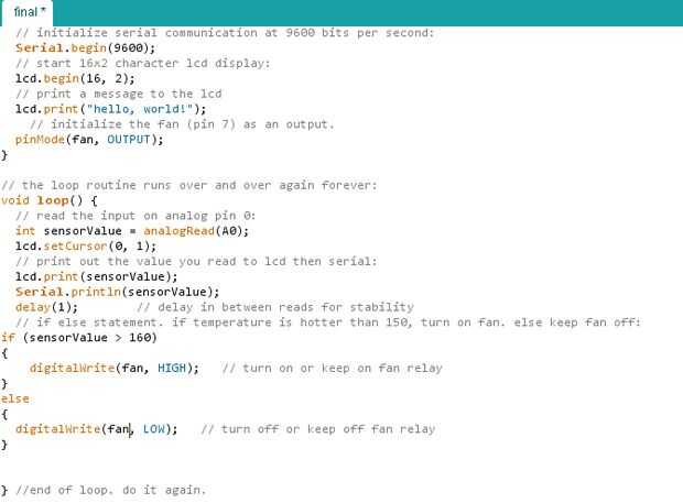 esta parte del código permite especificar distintas acciones que ocurren basan en variables de entrada, en este caso la temperatura, pero que podría ser la velocidad de un coche o luminosidad de una habitación o el tiempo o algunos cálculos de matemáticas, además puede controlar cualquier cosa, desde las luces de conmutación la radio o encender la cafetera en el momento adecuado. las posibilidades son realmente infinitas.