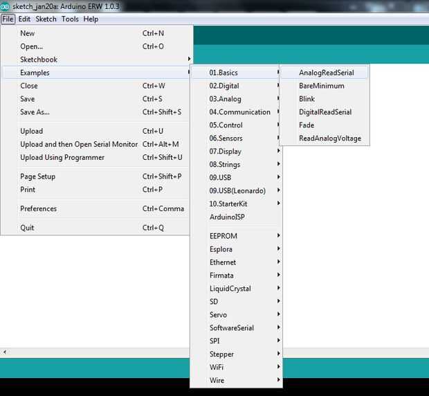 Comencé el bny software utilizando como base el "serial lectura analógica" añadir mi propio código a él.