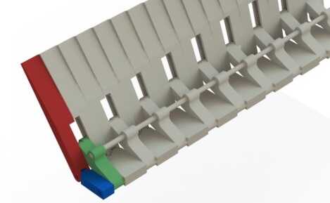 Cada brazo (rojo) tiene una ranura cortada en su lado. El rotor (verde) tiene dos espigas, una a cada lado, que se extienden en las ranuras de ambos brazos vecinos. Es clavado en la espalda de dos estatores (azul). Todos los rotores están conectados a una clavija a una distancia constante del perno estator. Así, cuando se mueve un rotor, todos los rotores se mueven a la misma velocidad angular. Con las dimensiones correctas para los rotores y los estatores (ya se han calculado las dimensiones del brazo), los péndulos se pueden lanzar al mismo tiempo.