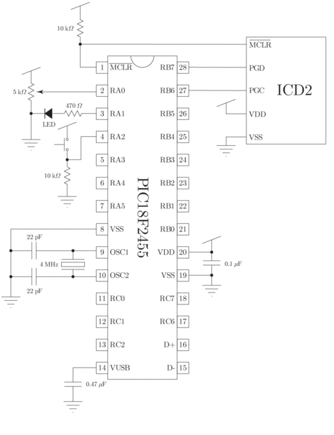 El único cambio que debe realizarse para este proyecto es reemplazar el LED y su resistencia con el cable para la señal de control. Así que en vez de conectar el pin 3 a una resistencia y luego a un LED y luego a tierra, sólo conectar el pin 3 al cable blanco, amarillo del servo. El bloque de ICD2 representa el programador PIC que utiliza, sustituir su propia si quieres. Además, no olvide conectar la alimentación del servo y conexión a tierra.
