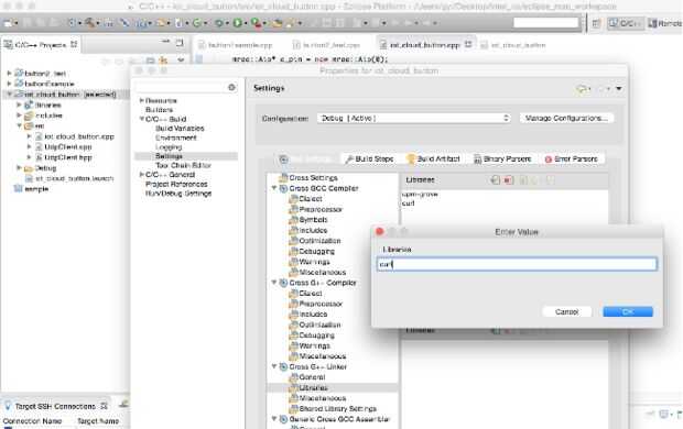 Haga clic derecho sobre el proyecto y seleccione Propiedades. Desplácese para C y C++ construir--> Configuración--> Cruz G ++ vinculador--> bibliotecas--> haga clic en los botones y verde y agregar la biblioteca de "curl"