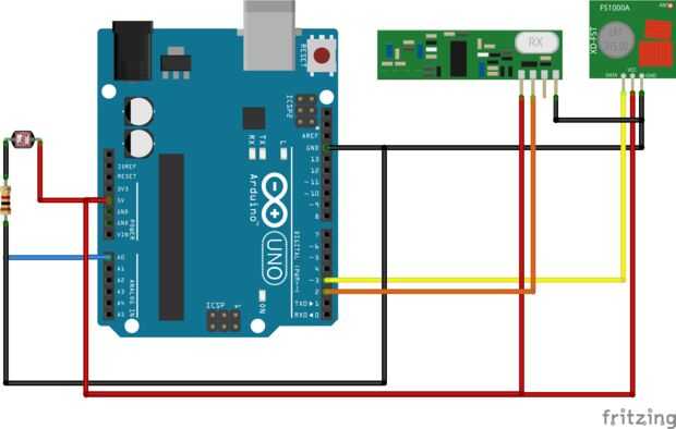 Usé el pin 2 en el Arduino para pin de datos y el pin 3 pin de datos del transmisoral receptor. El receptor tiene 2 pines de datos idénticos, basta con utilizar uno. La fotocélula es conectada al pin A0 en el Arduino. Sin embargo, necesitará usar un resistor conectado a uno de los pernos de la fotocélula. Mayoría de las veces, una Resistencia Ω de 10 k es suficiente, pero si va a utilizar en una sala brillante, puede que necesite para sustituirla por una resistencia de 1 k Ω, ya que probablemente se saturarán.
