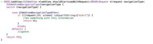 Como se mencionó anteriormente, hay una variedad de razones por las que se llamará a este método de delegado. Queremos que este código solamente si se llama a una alerta, por lo que necesitamos asegurar que el método no fue llamado por otra razón. En primer lugar, comprobamos el tipo de navegación. La alerta JS es un tipo de navegación de UINavigationTypeOther, así que para esta primera. Marcando primero el tipo de navegación, podemos asegurar que allí están no engorrosos basados en otras posibles cargas estándar.