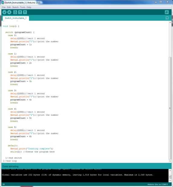 /* This code is to show the basic workings of a switch statement. It counts to 10 in the serial monitor using a delay.</p><p> Written by Progressive Automations Sept 21, 2015 This code is in the public domain */ int programCount = 0;//variable to move through the program void setup() { Serial.begin(9600);// initialize serial communication: programCount = 0;//start at the beginning }//end setup void loop() { switch (programCount) { case 0: delay(1000);//wait 1 second Serial.println("0");//print the number programCount = 1; break; case 1: delay(1000);//wait 1 second Serial.println("1");//print the number programCount = 2; break; case 2: delay(1000);//wait 1 second Serial.println("2");//print the number programCount = 3; break; case 3: delay(1000);//wait 1 second Serial.println("3");//print the number programCount = 4; break; case 4: delay(1000);//wait 1 second Serial.println("4");//print the number programCount = 5; break; case 5: delay(1000);//wait 1 second Serial.println("5");//print the number programCount = 6; break; default: Serial.print("Counting complete"); while(1); //freeze the program here }//end switch }//end loop